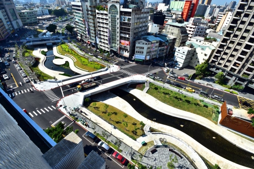 柳川是一條會呼吸的河川,拓寬兩側護岸改為緩坡,有助排水及透水,創造出如同海綿般吸水的彈性空間。